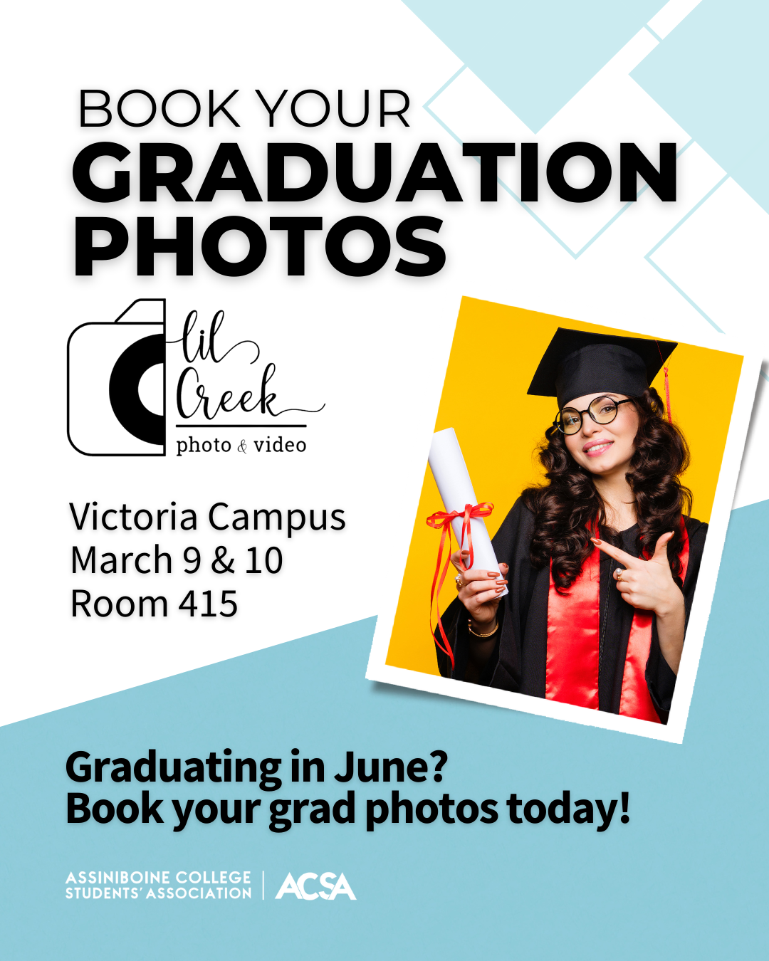 Graduation photos will take place at the Victoria Campus on March 9 and March 10 in the ACSA Boardroom (room 415).