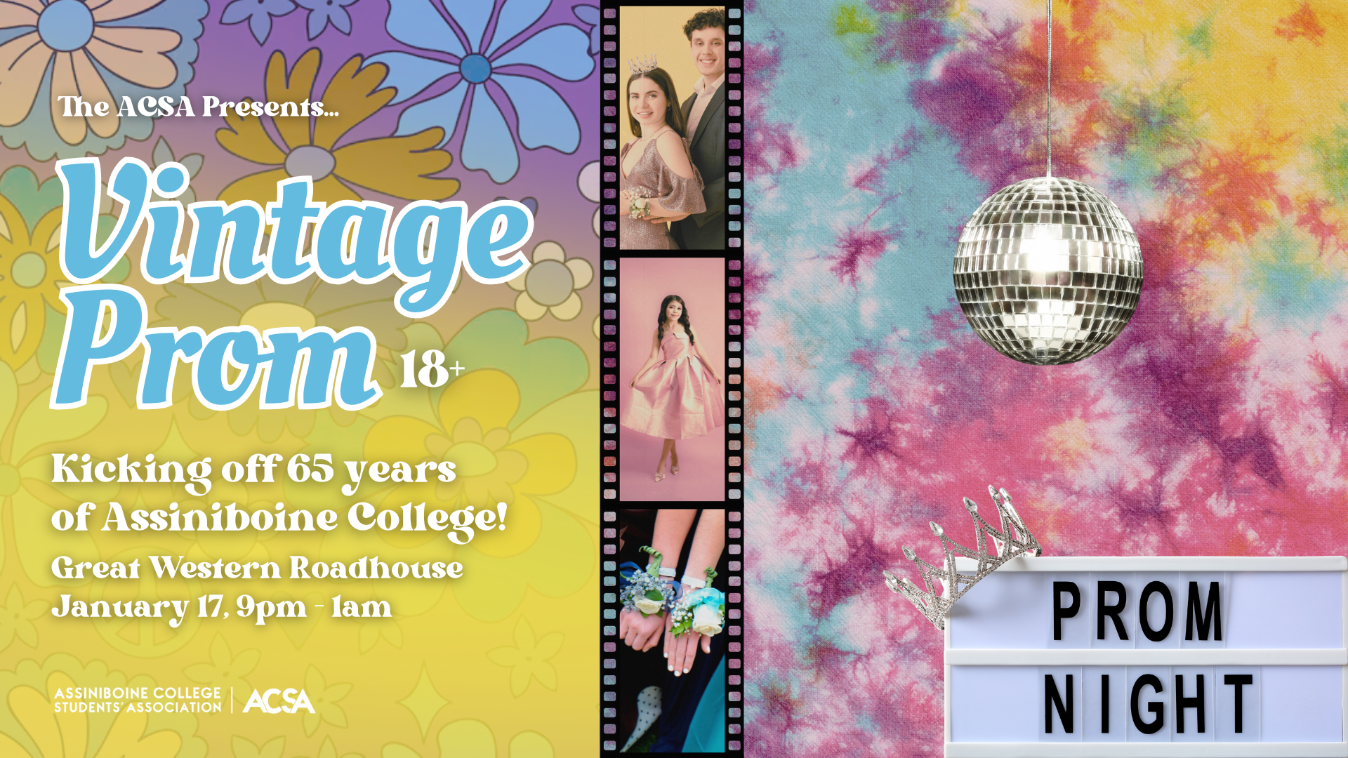 We’re kicking off 65 years of Assiniboine College with Vintage Prom that’s coming on January 17th, 2026 at The Great Western Roadhouse. Tickets are only $10 and can be purchased at the ACSA Office.